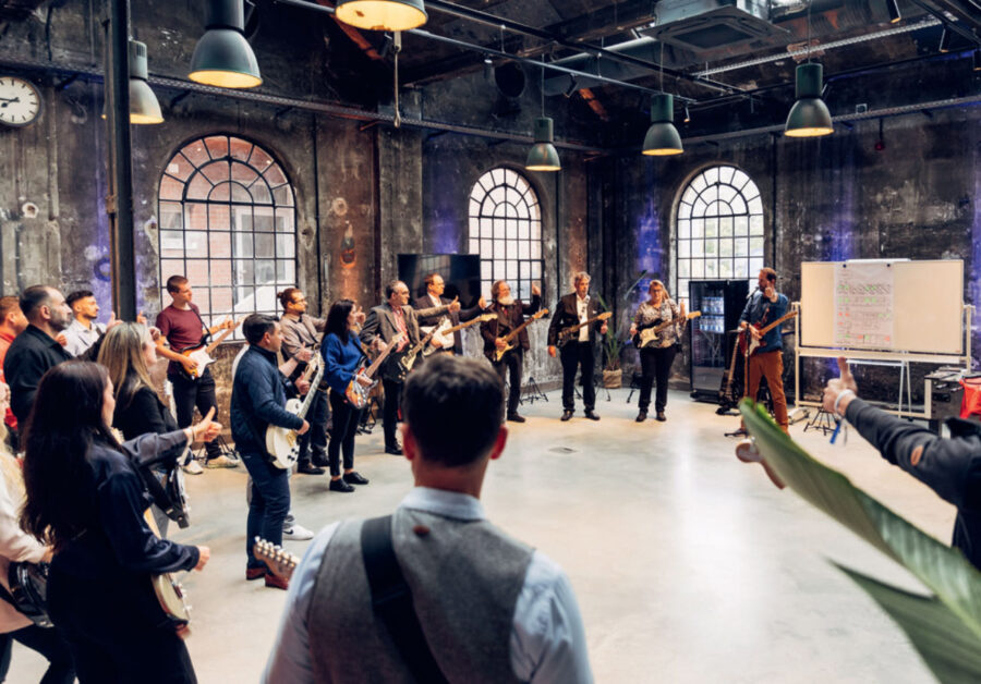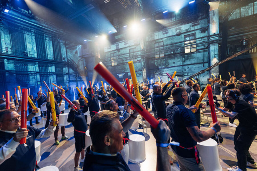 The central guiding idea was the specially composed company song “One Step Further”, which served as a framework in terms of content and design. The event followed a three-tier structure: After the surprising live premiere of the song, 500 participants took the helm themselves in groups – divided between singing, e-guitar and drums. Under the instruction of professional coaches, within just a few hours a shared performance emerged that culminated in a final music video shooting. The event took place in a former steel smithery that transformed creatively over the course of the event – from a traditional stage situation to interactive rehearsal rooms and a central shooting setting.